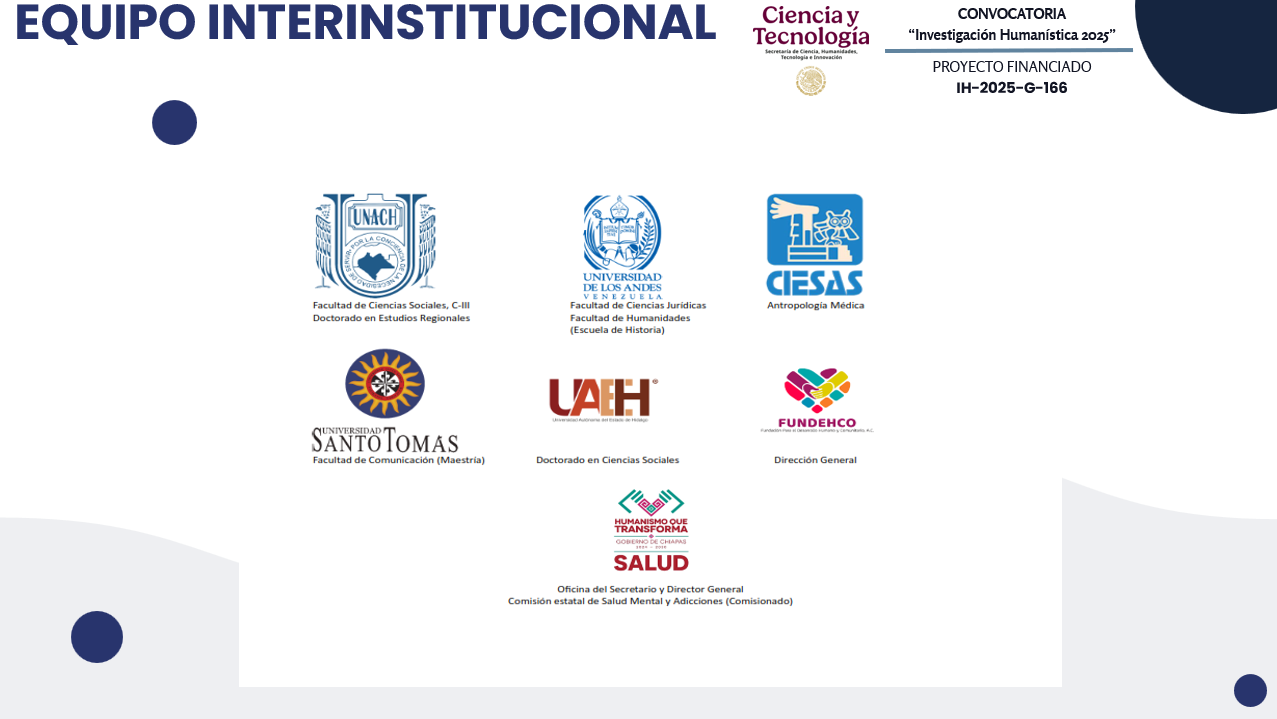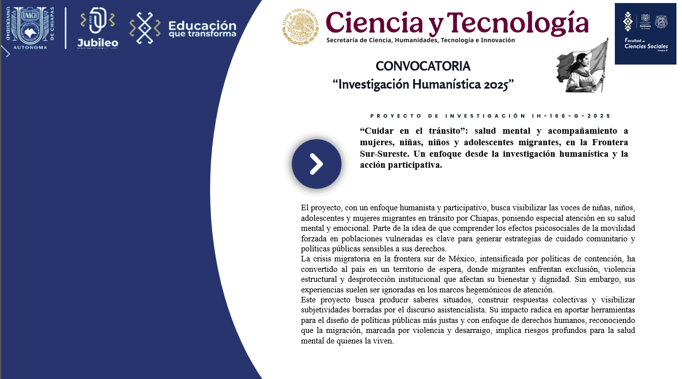 PROYECTOS Observatorio Regional sobre la problemática de suicidio en población indígena Doctorado en Estudios Políticos (Venezuela - México) Comunicación, Paz y Conflicto (Colombia - México) PROYECTO DE INVESTIGACIÓN IH-166-G-2025 Haz clic para ampliar